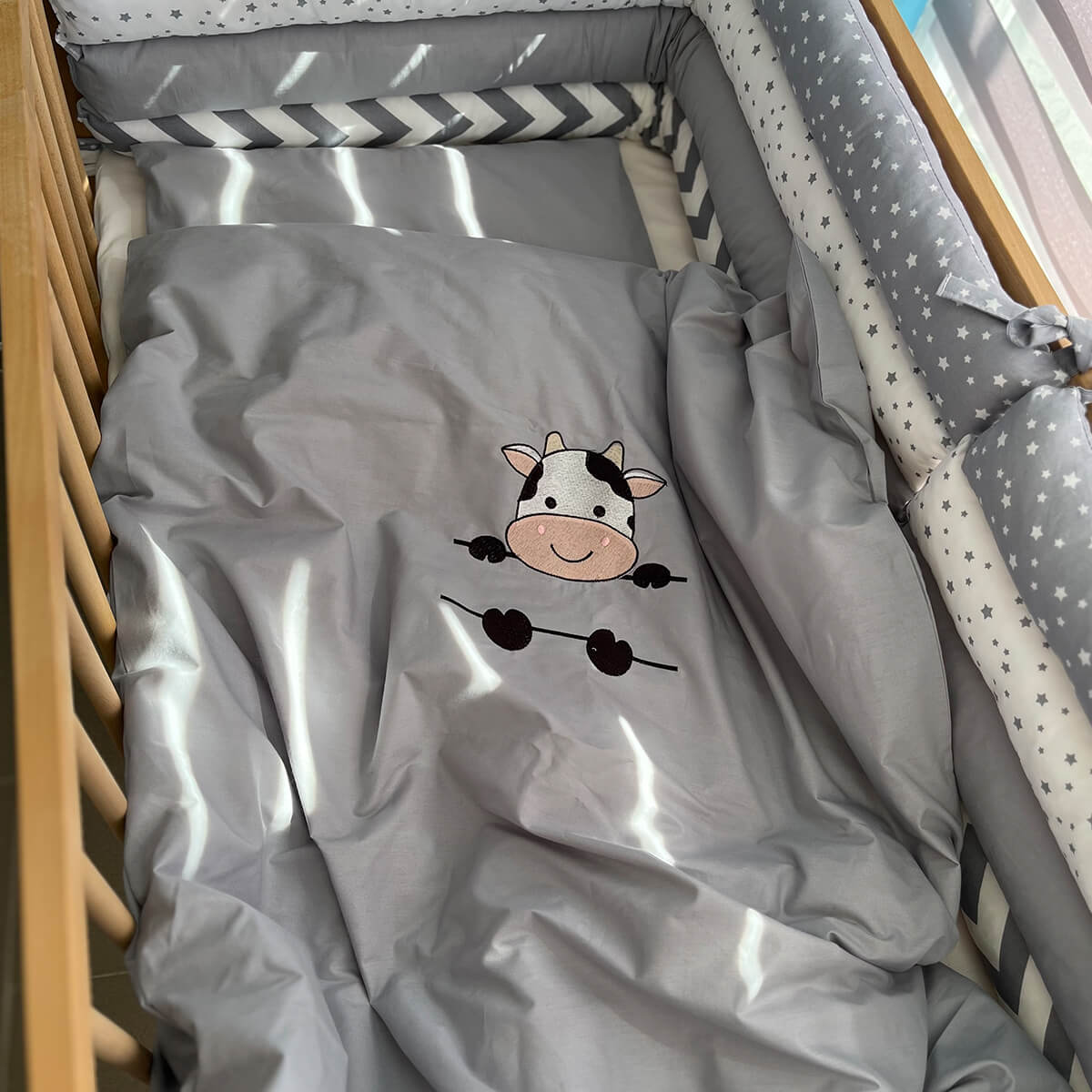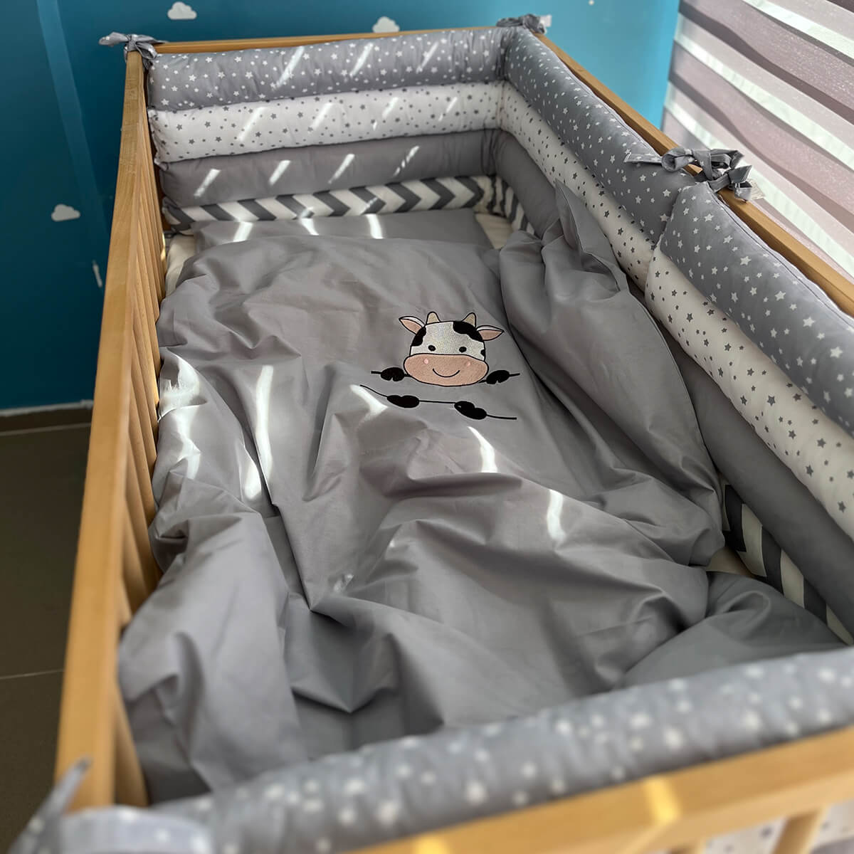 - Ogradica (2 dela) – dimenzije 120×35 cm. Pokriva dve kraće i jednu dužu stranu kreveca, štiteći bebu od udaraca i stvarajući osećaj sigurnosti.