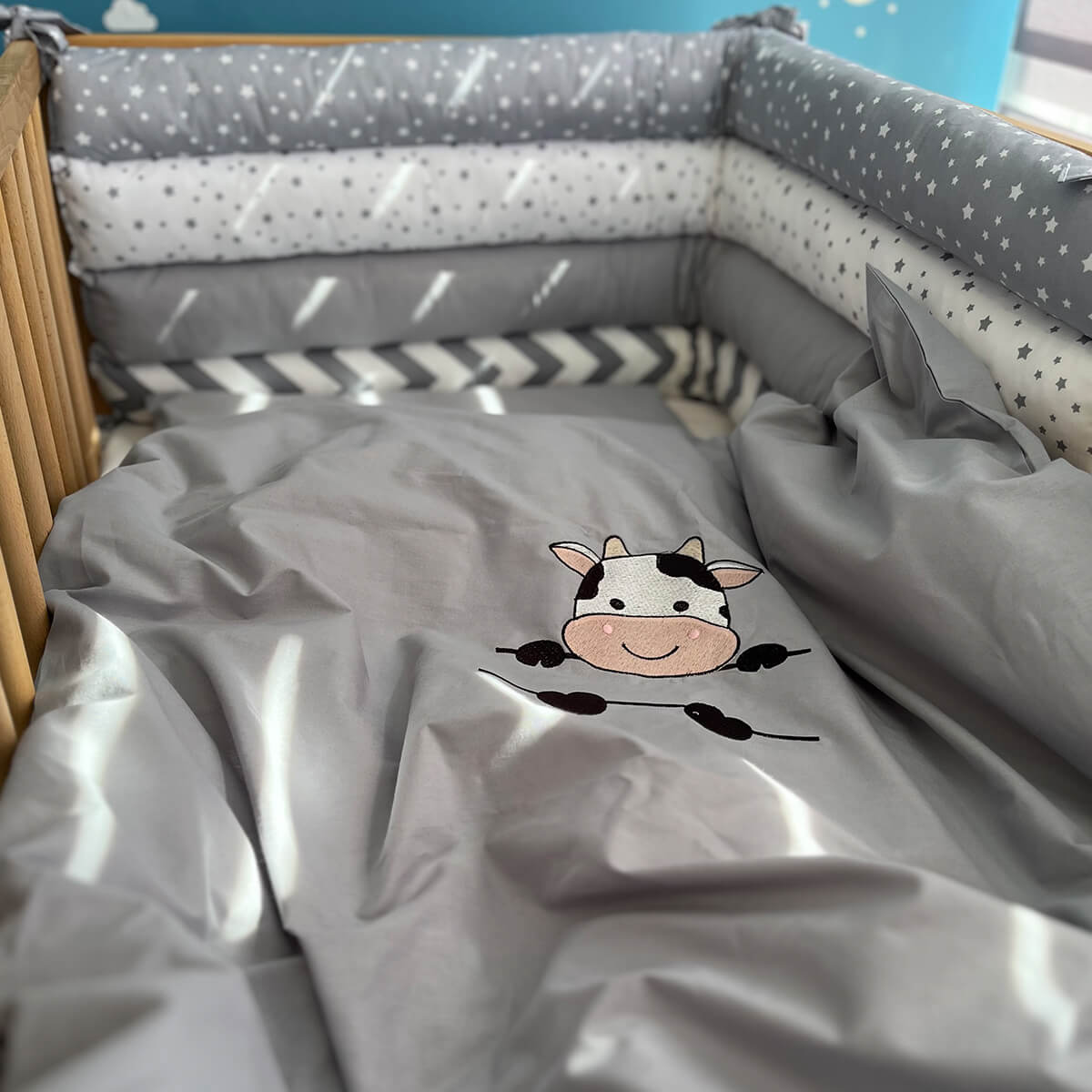 - Poseban detalj za personalizaciju – na navlaci jorgana nalazi se označeno mesto predviđeno za izvezeno ime deteta, što komplet čini idealnim i ličnim poklonom.